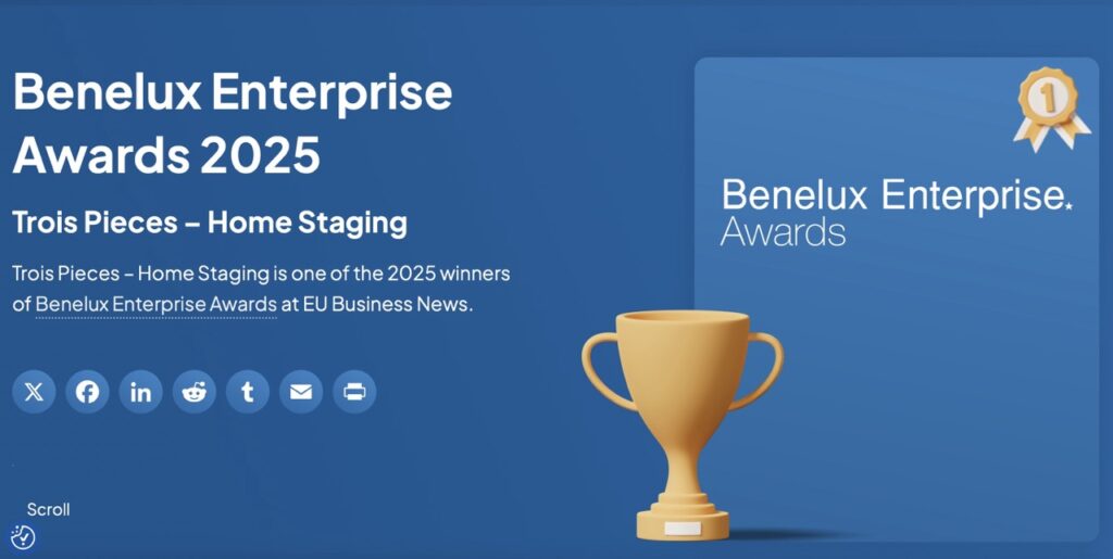 Trois Pièces Home Staging a été nommée « Best Home Staging Company 2025 – Belgium » des Benelux Enterprise Awards – EU Business News